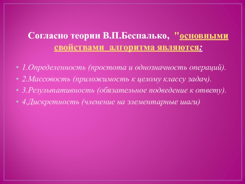 Слайд 5Согласно теории В.П.Беспалько, "основными свойствами алгоритма являются: