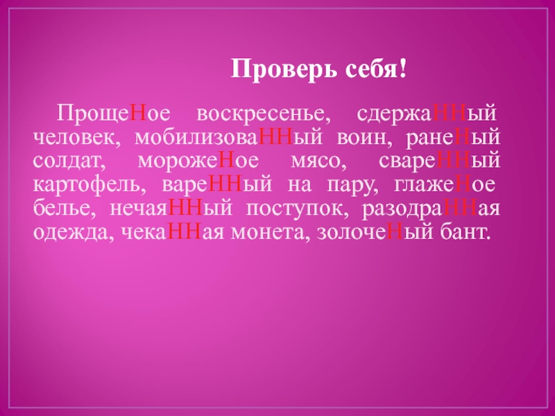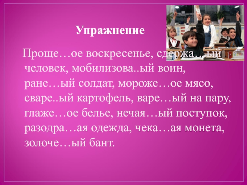 Проще…ое воскресенье, сдержа…ый человек, мобилизова..ый воин, ране…ый солдат, мороже…ое