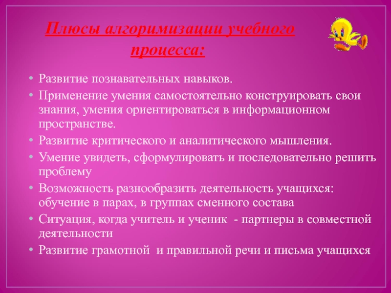 Слайд 14 Плюсы алгоримизации учебного процесса: