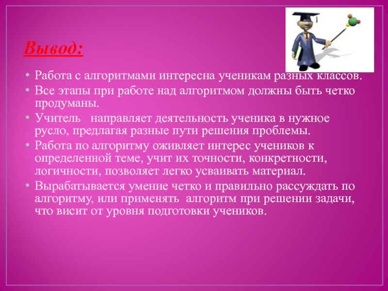 Работа по алгоритму оживляет интерес учеников к определенной теме, учит их точности, конкретности, логичности, позволяет легко усваивать материал.