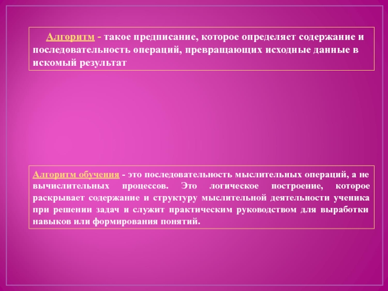Алгоритм обучения - это последовательность мыслительных операций, а не вычислительных процессов. Это логическое построение, которое раскрывает содержание и структуру мыслительной деятельности ученика при решении задач и служит практическим руководством для выработки навыков или формирования понятий.