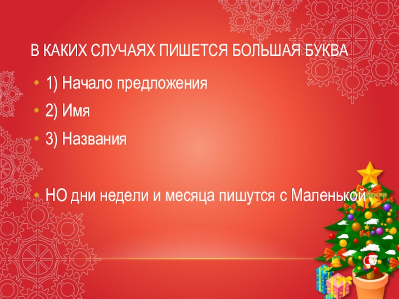 В каких случаях пишется большая буква1) Начало предложения2) Имя3) НазванияНО дни недели и месяца пишутся с Маленькой