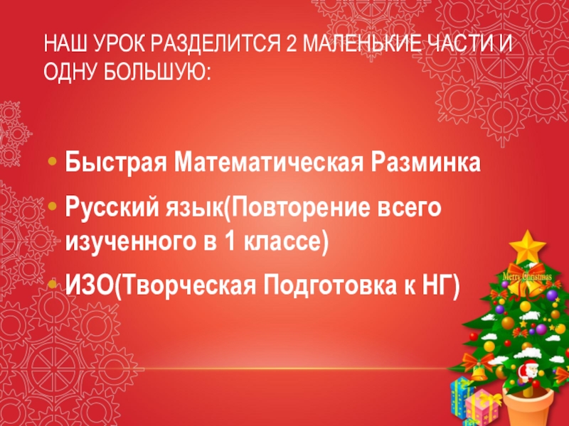 Наш урок разделится 2 маленькие части и одну большую:Быстрая Математическая РазминкаРусский язык(Повторение всего изученного в 1 классе)ИЗО(Творческая Подготовка к НГ)