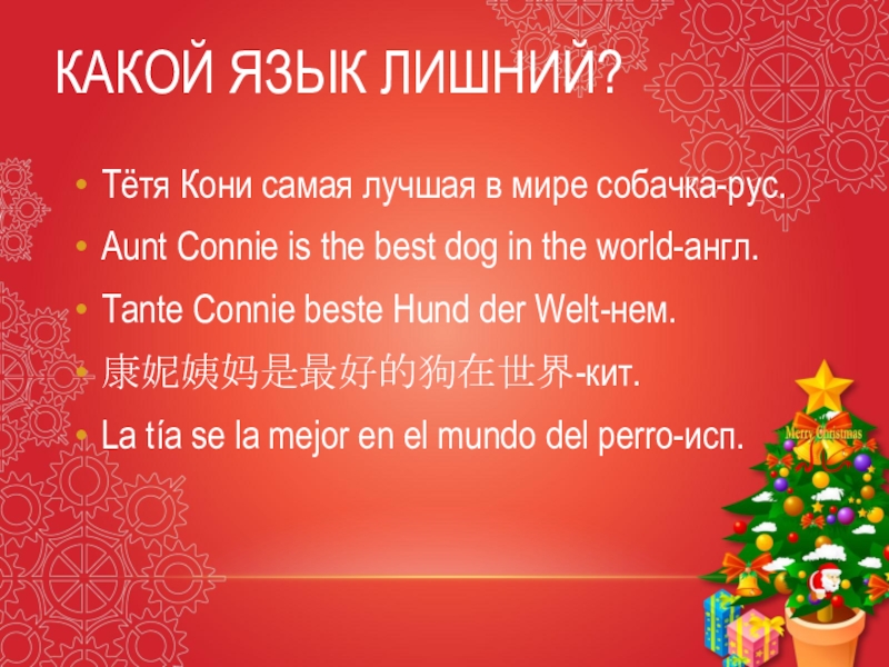 Какой язык лишний?Тётя Кони самая лучшая в мире собачка-рус.Aunt Connie is the best dog in the world-англ.Tante