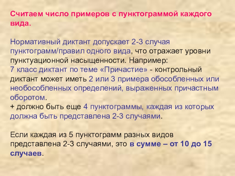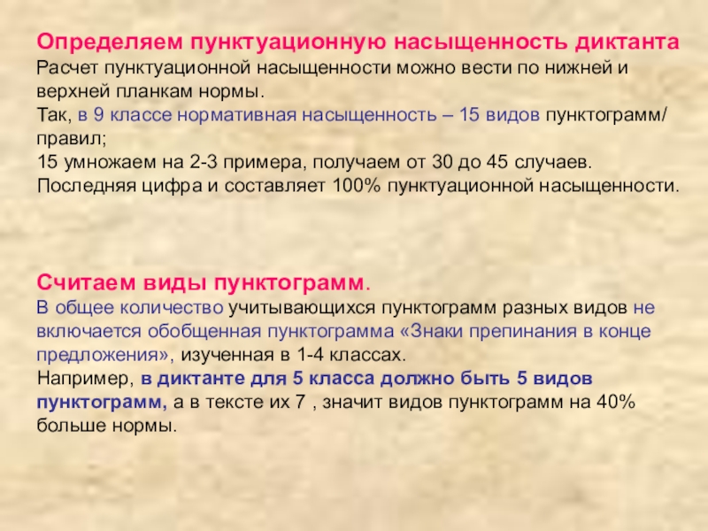 Например, в диктанте для 5 класса должно быть 5 видов пунктограмм, а в тексте их 7 , значит видов пунктограмм на 40% больше нормы.