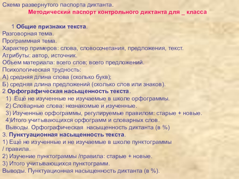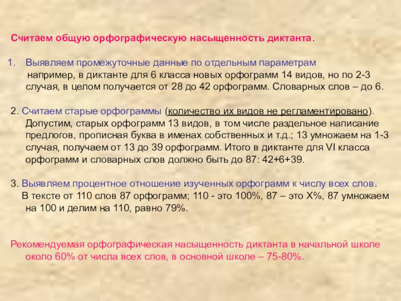 Рекомендуемая орфографическая насыщенность диктанта в начальной школе около 60% от числа всех слов, в основной школе – 75-80%.