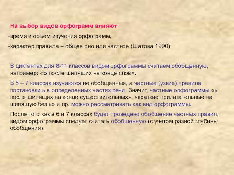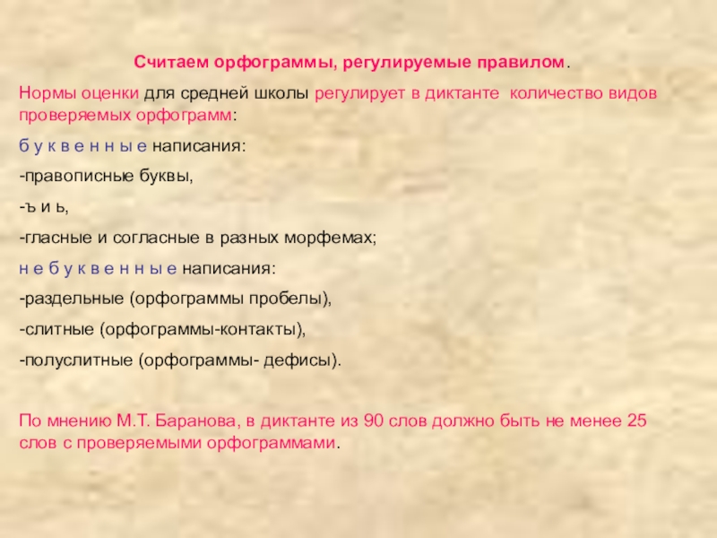 По мнению М.Т. Баранова, в диктанте из 90 слов должно быть не менее 25 слов с проверяемыми орфограммами.