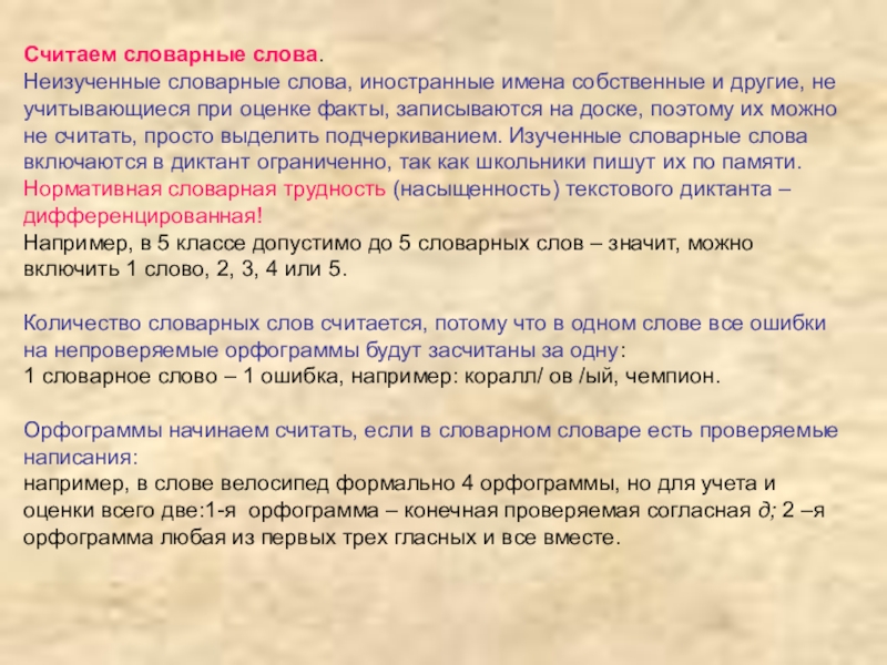 не учитывающиеся при оценке факты, записываются на доске, поэтому их можно не считать, просто выделить подчеркиванием. Изученные словарные слова включаются в диктант ограниченно, так как школьники пишут их по памяти. Нормативная словарная трудность (насыщенность) текстового диктанта – дифференцированная!