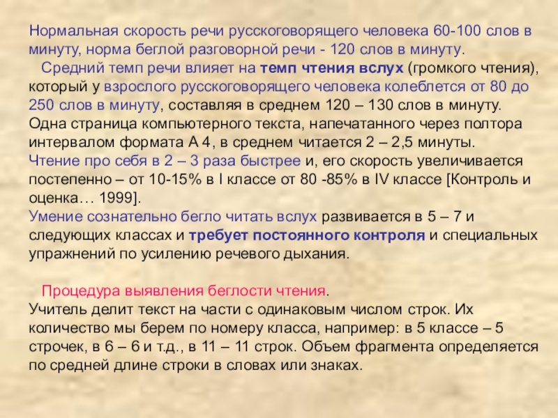 Слайд 18Нормальная скорость речи русскоговорящего человека 60-100 слов в минуту, норма беглой