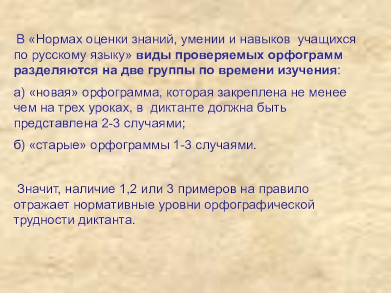 а) «новая» орфограмма, которая закреплена не менее чем на трех уроках, в диктанте должна быть представлена 2-3 случаями;
