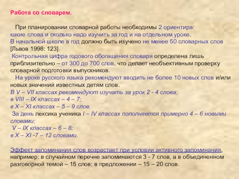 В начальной школе в год должно быть изучено не менее 50 словарных слов [Львов 1998: 123].