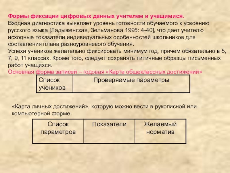 готовности обучаемого к усвоению русского языка [Ладыженская, Зельманова 1995: 4-40], что дает учителю исходные показатели индивидуальных особенностей школьников для составления плана разноуровневого обучения.