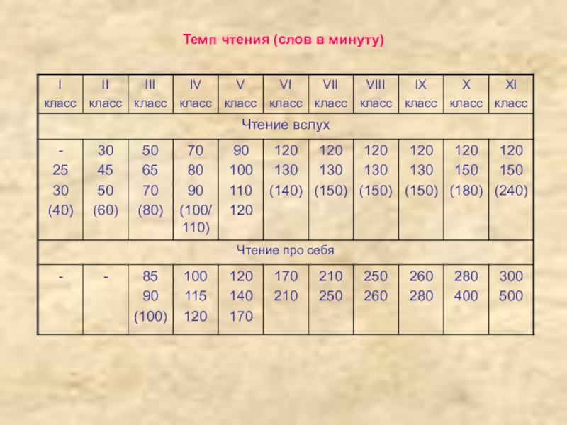 Чтение про себя в 2 – 3 раза быстрее и, его скорость увеличивается постепенно – от 10-15% в I классе от 80 -85% в IV классе [Контроль и оценка… 1999].