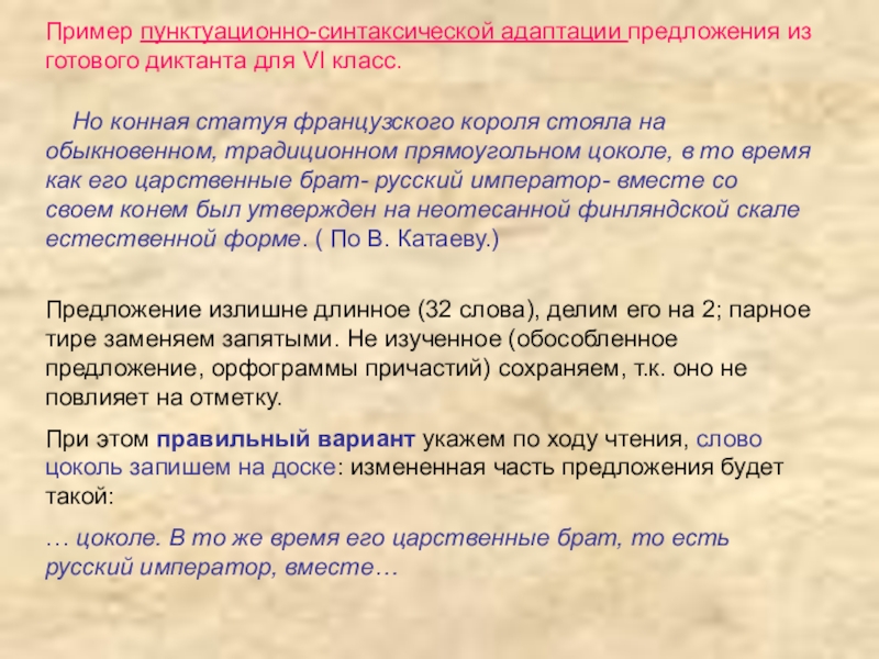 Слайд 13Пример пунктуационно-синтаксической адаптации предложения из готового диктанта для VI класс.