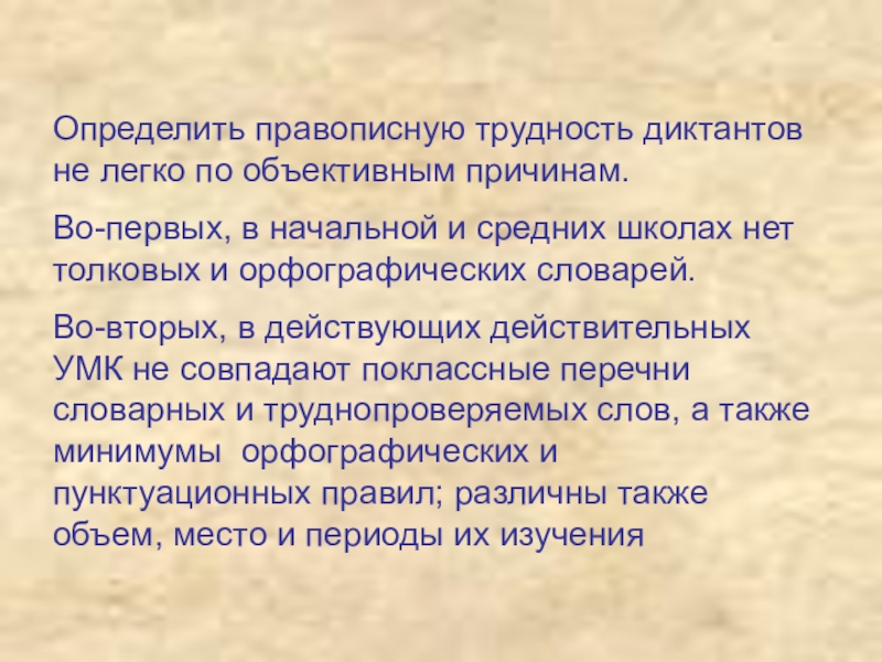 Слайд 4Определить правописную трудность диктантов не легко по объективным причинам.