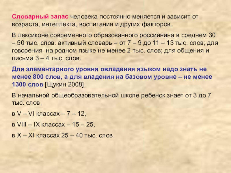 Слайд 16Словарный запас человека постоянно меняется и зависит от возраста, интеллекта, воспитания