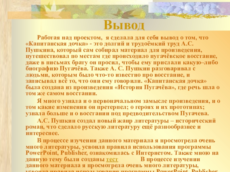 В процессе изучении данного материала я просмотрела очень много литературы, усвоила правила использования программы PowerPoint, Publisher, ознакомилась с Интернетом. Также мною на данную тему были созданы тест В процессе изучении данного материала я просмотрела очень много литературы, усвоила правила использования программы PowerPoint, Publisher, ознакомилась с Интернетом. Также мною на данную тему были созданы тест и в программе буклет.