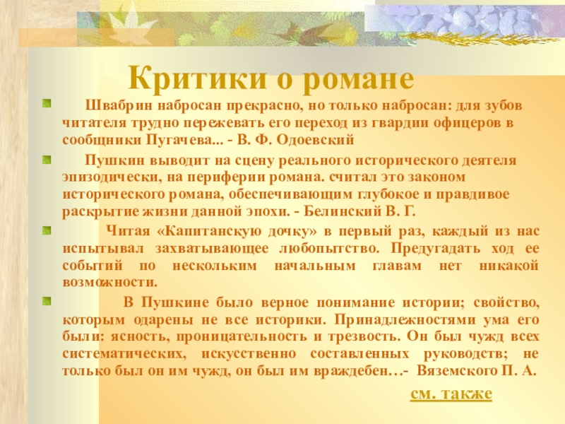 набросан прекрасно, но только набросан: для зубов читателя трудно пережевать его переход из гвардии офицеров в сообщники Пугачева... - В. Ф. Одоевский