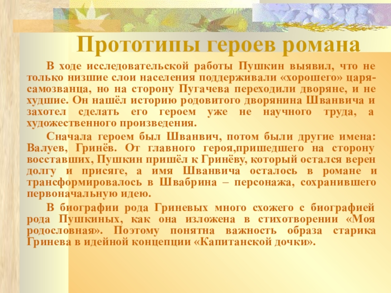 что не только низшие слои населения поддерживали «хорошего» царя-самозванца, но на сторону Пугачева переходили дворяне, и не худшие. Он нашёл историю родовитого дворянина Шванвича и захотел сделать его героем уже не научного труда, а художественного произведения.