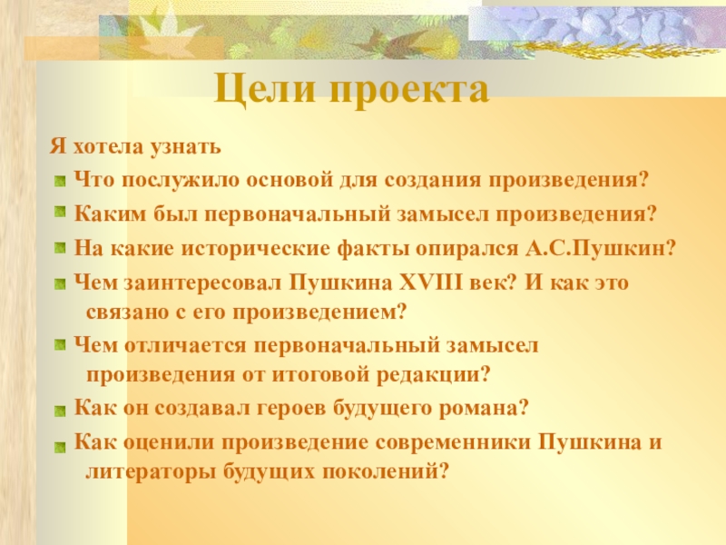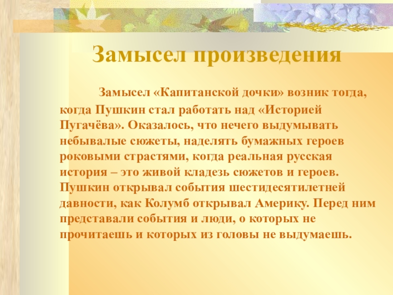 возник тогда, когда Пушкин стал работать над «Историей Пугачёва». Оказалось, что нечего выдумывать небывалые сюжеты, наделять бумажных героев роковыми страстями, когда реальная русская история – это живой кладезь сюжетов и героев. Пушкин открывал события шестидесятилетней давности, как Колумб открывал Америку. Перед ним представали события и люди, о которых не прочитаешь и которых из головы не выдумаешь.