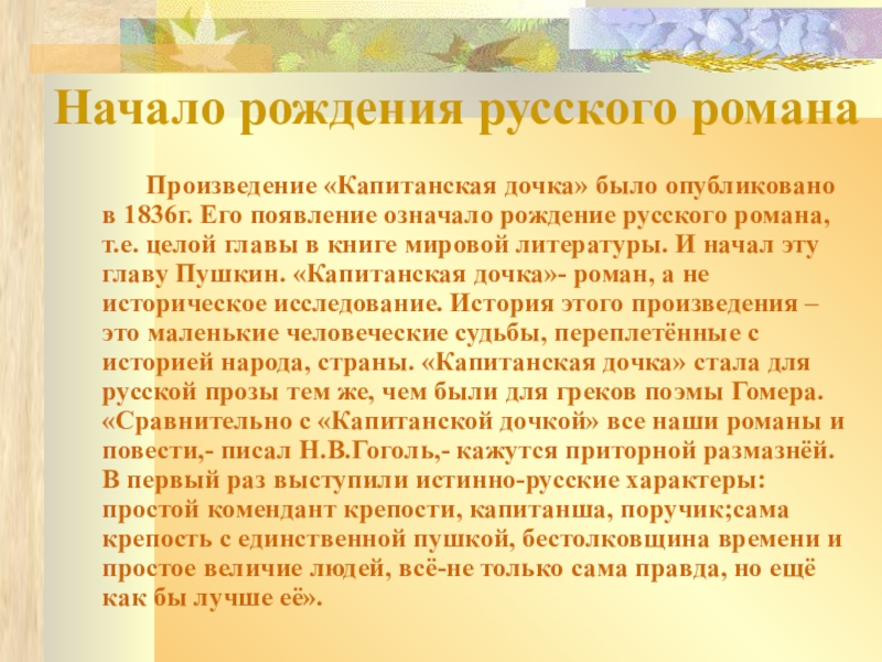 появление означало рождение русского романа, т.е. целой главы в книге мировой литературы. И начал эту главу Пушкин. «Капитанская дочка»- роман, а не историческое исследование. История этого произведения – это маленькие человеческие судьбы, переплетённые с историей народа, страны. «Капитанская дочка» стала для русской прозы тем же, чем были для греков поэмы Гомера. «Сравнительно с «Капитанской дочкой» все наши романы и повести,- писал Н.В.Гоголь,- кажутся приторной размазнёй. В первый раз выступили истинно-русские характеры:простой комендант крепости, капитанша, поручик;сама крепость с единственной пушкой, бестолковщина времени и простое величие людей, всё-не только сама правда, но ещё как бы лучше её».
