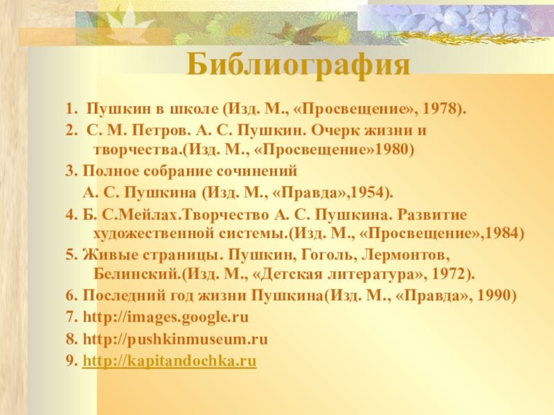 4. Б. С.Мейлах.Творчество А. С. Пушкина. Развитие художественной системы.(Изд. М., «Просвещение»,1984)