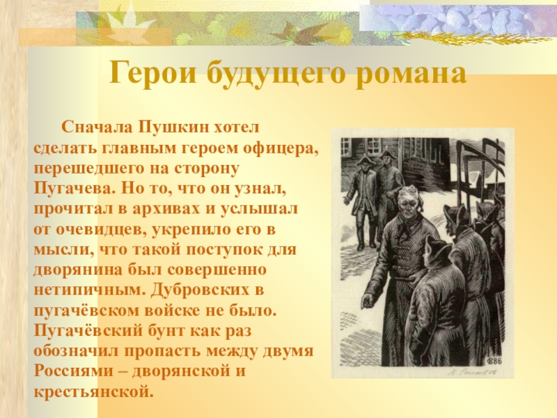 главным героем офицера, перешедшего на сторону Пугачева. Но то, что он узнал, прочитал в архивах и услышал от очевидцев, укрепило его в мысли, что такой поступок для дворянина был совершенно нетипичным. Дубровских в пугачёвском войске не было. Пугачёвский бунт как раз обозначил пропасть между двумя Россиями – дворянской и крестьянской.