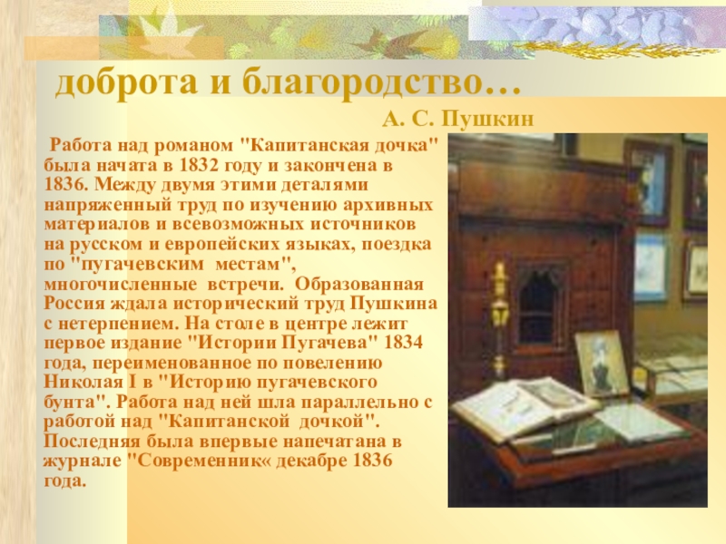 Работа над романом "Капитанская дочка" была начата в 1832 году и закончена в 1836. Между двумя этими деталями напряженный труд по изучению архивных материалов и всевозможных источников на русском и европейских языках, поездка по "пугачевским местам", многочисленные встречи. Образованная Россия ждала исторический труд Пушкина с нетерпением. На столе в центре лежит первое издание "Истории Пугачева" 1834 года, переименованное по повелению Николая I в "Историю пугачевского бунта". Работа над ней шла параллельно с работой над "Капитанской дочкой". Последняя была впервые напечатана в журнале "Современник« декабре 1836 года.