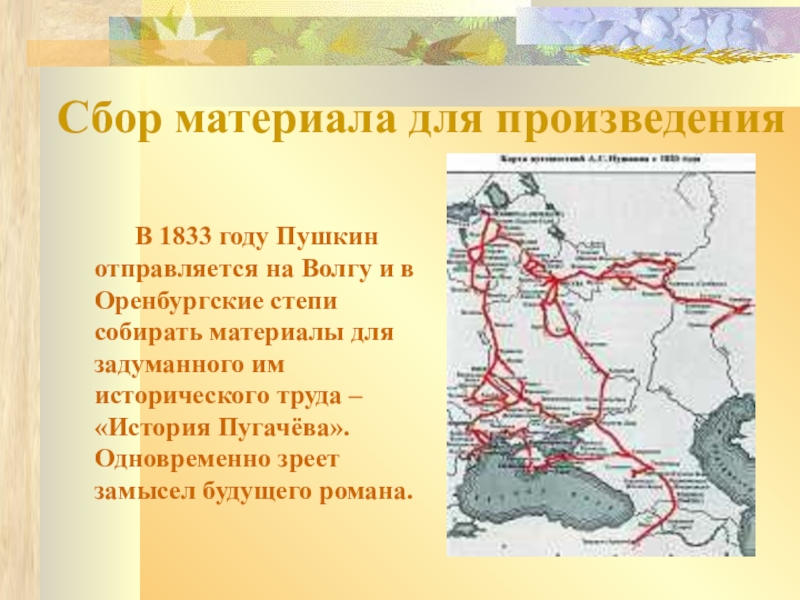 году Пушкин отправляется на Волгу и в Оренбургские степи собирать материалы для задуманного им исторического труда – «История Пугачёва». Одновременно зреет замысел будущего романа.