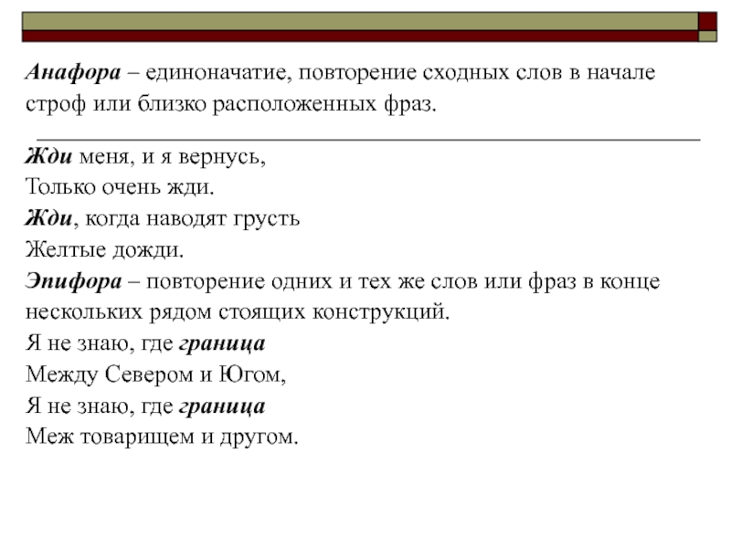 Слайд 12Анафора – единоначатие, повторение сходных слов в начале