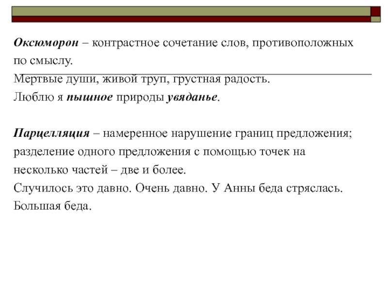 Слайд 11Оксюморон – контрастное сочетание слов, противоположных