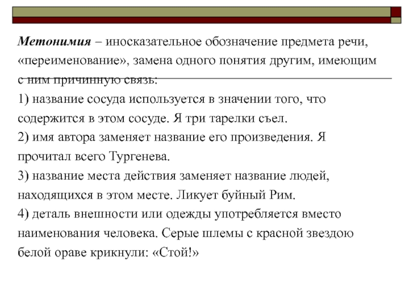 Слайд 6Метонимия – иносказательное обозначение предмета речи,