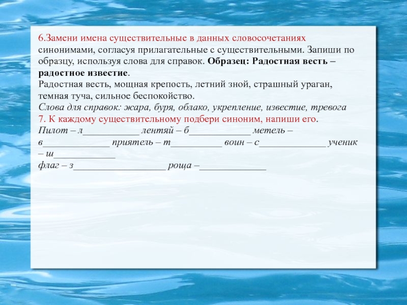 6.Замени имена существительные в данных словосочетаниях синонимами, согласуя прилагательные с существительными.