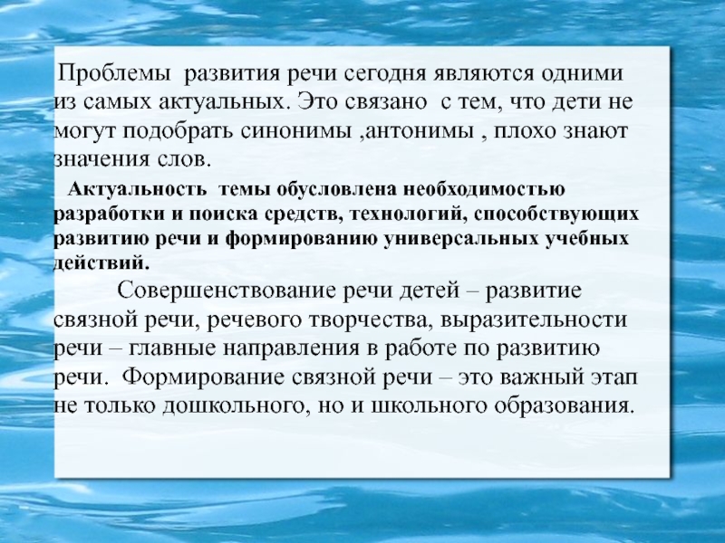 Актуальность темы обусловлена необходимостью разработки и поиска средств, технологий, способствующих развитию речи и формированию универсальных учебных действий.