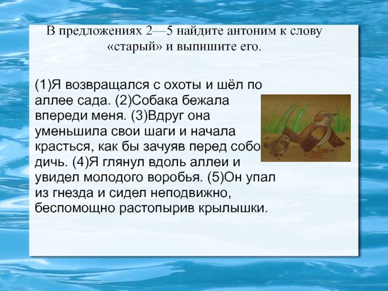 Слайд 22В предложениях 2—5 найдите антоним к слову «старый» и выпишите его.