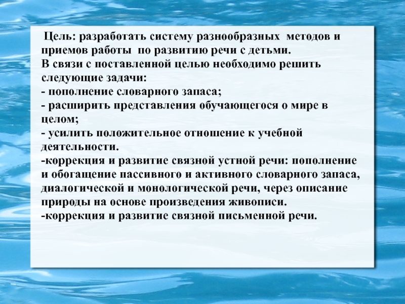 Слайд 4 Цель: разработать систему разнообразных методов и приемов работы по развитию