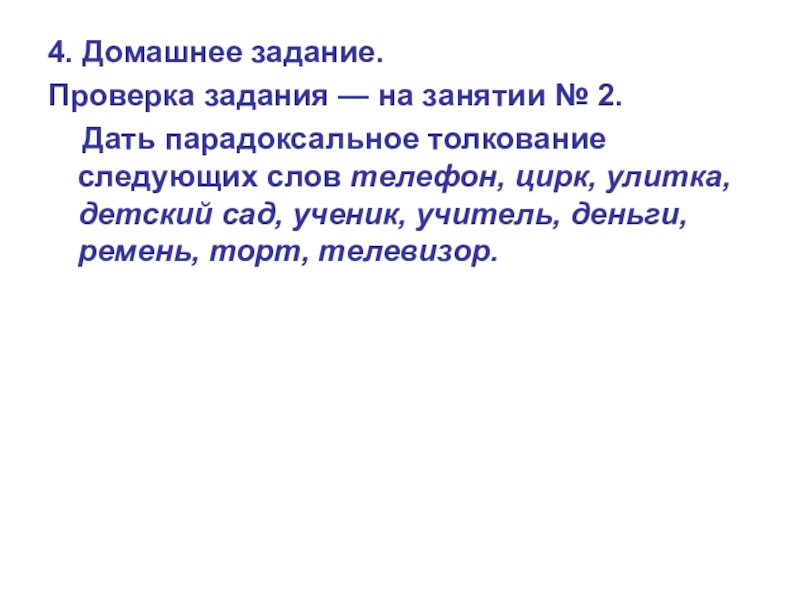 парадоксальное толкование следующих слов телефон, цирк, улитка, детский сад, ученик, учитель, деньги, ремень, торт, телевизор.
