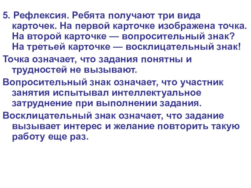 5. Рефлексия. Ребята получают три вида карточек. На первой карточке изображена точка.