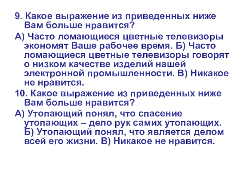 цветные телевизоры экономят Ваше рабочее время. Б) Часто ломающиеся цветные телевизоры говорят о низком качестве изделий нашей электронной промышленности. В) Никакое не нравится.