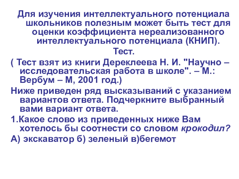 ( Тест взят из книги Дереклеева Н. И. ''Научно – исследовательская работа в школе''. – М.: Вербум – М, 2001 год.)