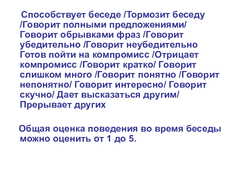 фраз /Говорит убедительно /Говорит неубедительно Готов пойти на компромисс /Отрицает компромисс /Говорит кратко/ Говорит слишком много /Говорит понятно /Говорит непонятно/ Говорит интересно/ Говорит скучно/ Дает высказаться другим/ Прерывает других