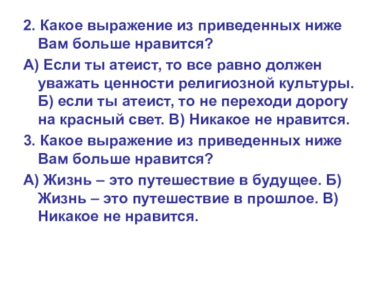 атеист, то все равно должен уважать ценности религиозной культуры. Б) если ты атеист, то не переходи дорогу на красный свет. В) Никакое не нравится.