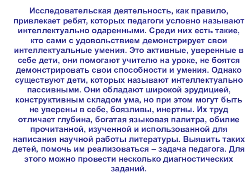 одаренными. Среди них есть такие, кто сами с удовольствием демонстрирует свои интеллектуальные умения. Это активные, уверенные в себе дети, они помогают учителю на уроке, не боятся демонстрировать свои способности и умения. Однако существуют дети, которых называют интеллектуально пассивными. Они обладают широкой эрудицией, конструктивным складом ума, но при этом могут быть не уверены в себе, боязливы, инертны. Их труд отличает глубина, богатая языковая палитра, обилие прочитанной, изученной и использованной для написания научной работы литературы. Выявить таких детей, помочь им реализоваться – задача педагога. Для этого можно провести несколько диагностических заданий.