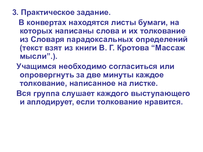 Учащимся необходимо согласиться или опровергнуть за две минуты каждое толкование, написанное на листке.