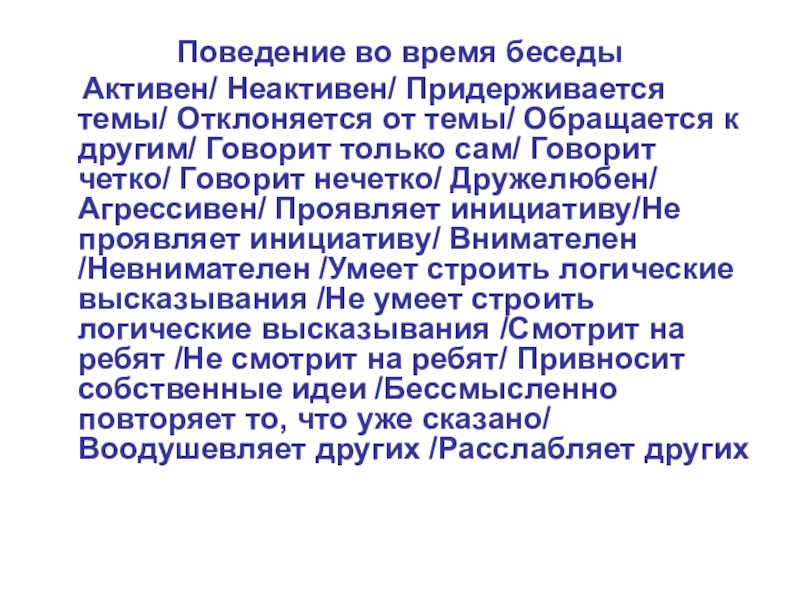 темы/ Обращается к другим/ Говорит только сам/ Говорит четко/ Говорит нечетко/ Дружелюбен/ Агрессивен/ Проявляет инициативу/Не проявляет инициативу/ Внимателен /Невнимателен /Умеет строить логические высказывания /Не умеет строить логические высказывания /Смотрит на ребят /Не смотрит на ребят/ Привносит собственные идеи /Бессмысленно повторяет то, что уже сказано/ Воодушевляет других /Расслабляет других