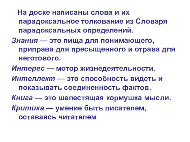 слова и их толкование из Словаря парадоксальных определений (текст взят из книги В. Г. Кротова “Массаж мысли”.).
