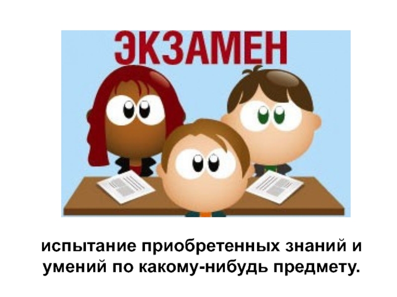 Слайд 3испытание приобретенных знаний и умений по какому-нибудь предмету.