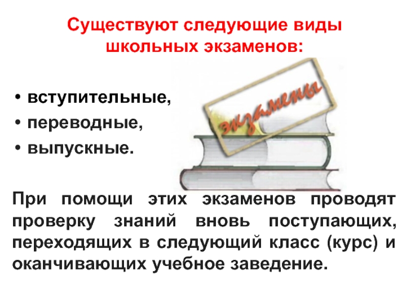 Существуют следующие виды      школьных экзаменов:вступительные, переводные, выпускные.При помощи этих экзаменов проводят проверку