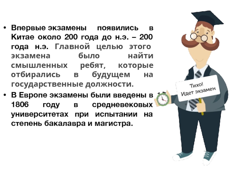 Слайд 6Впервые экзамены появились в Китае около 200 года до н.э. – 200