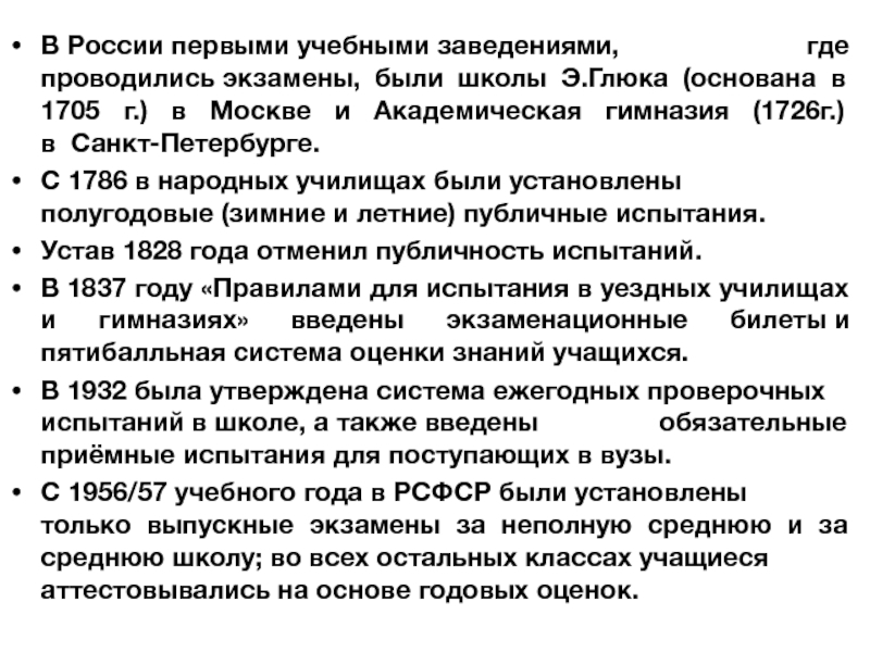 В России первыми учебными заведениями, где         проводились экзамены, были школы Э.Глюка (основана в 1705
